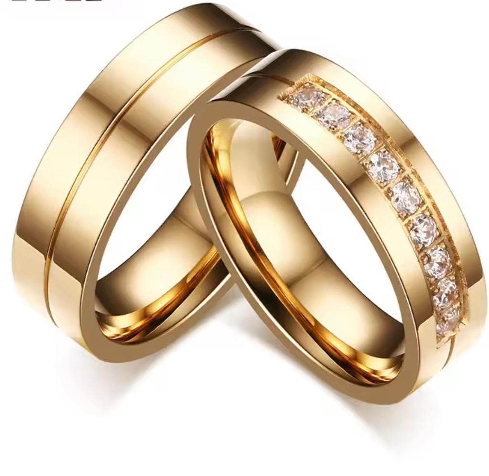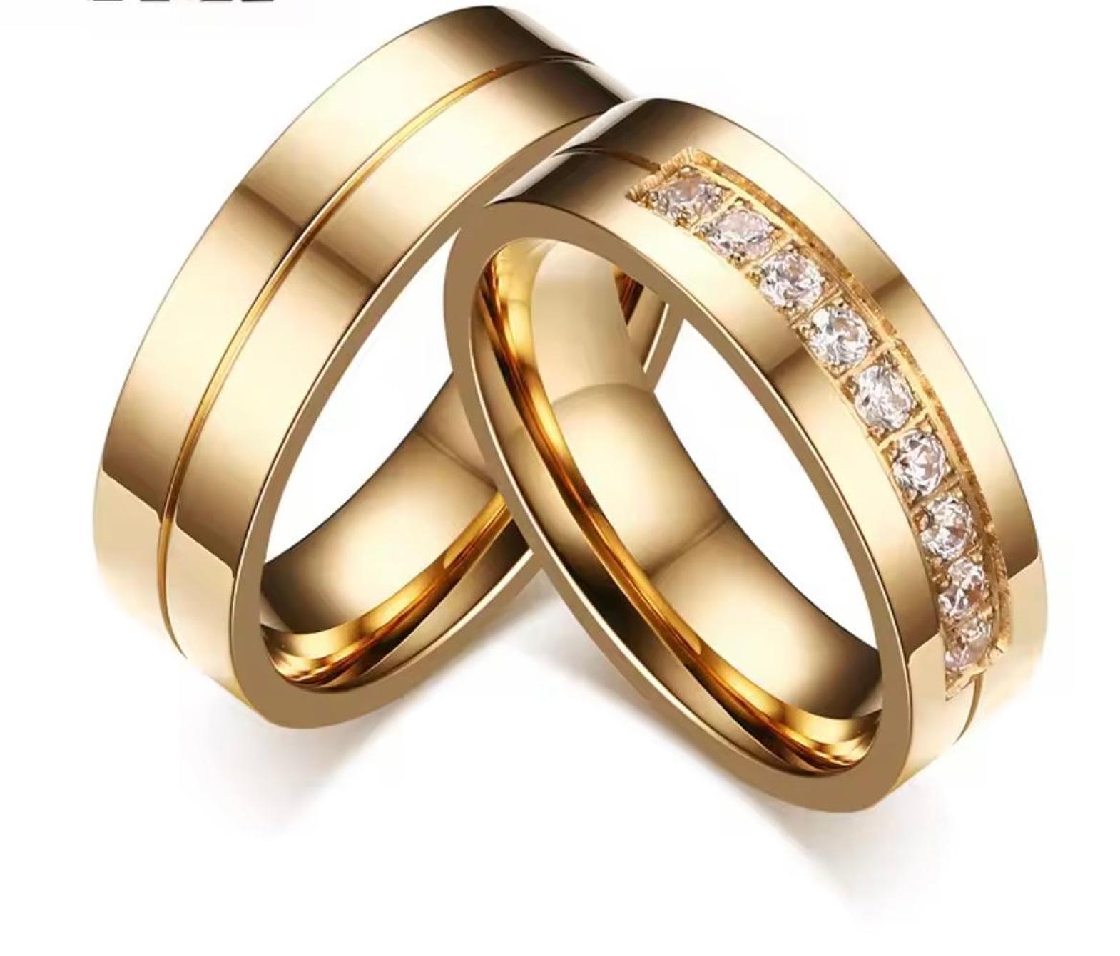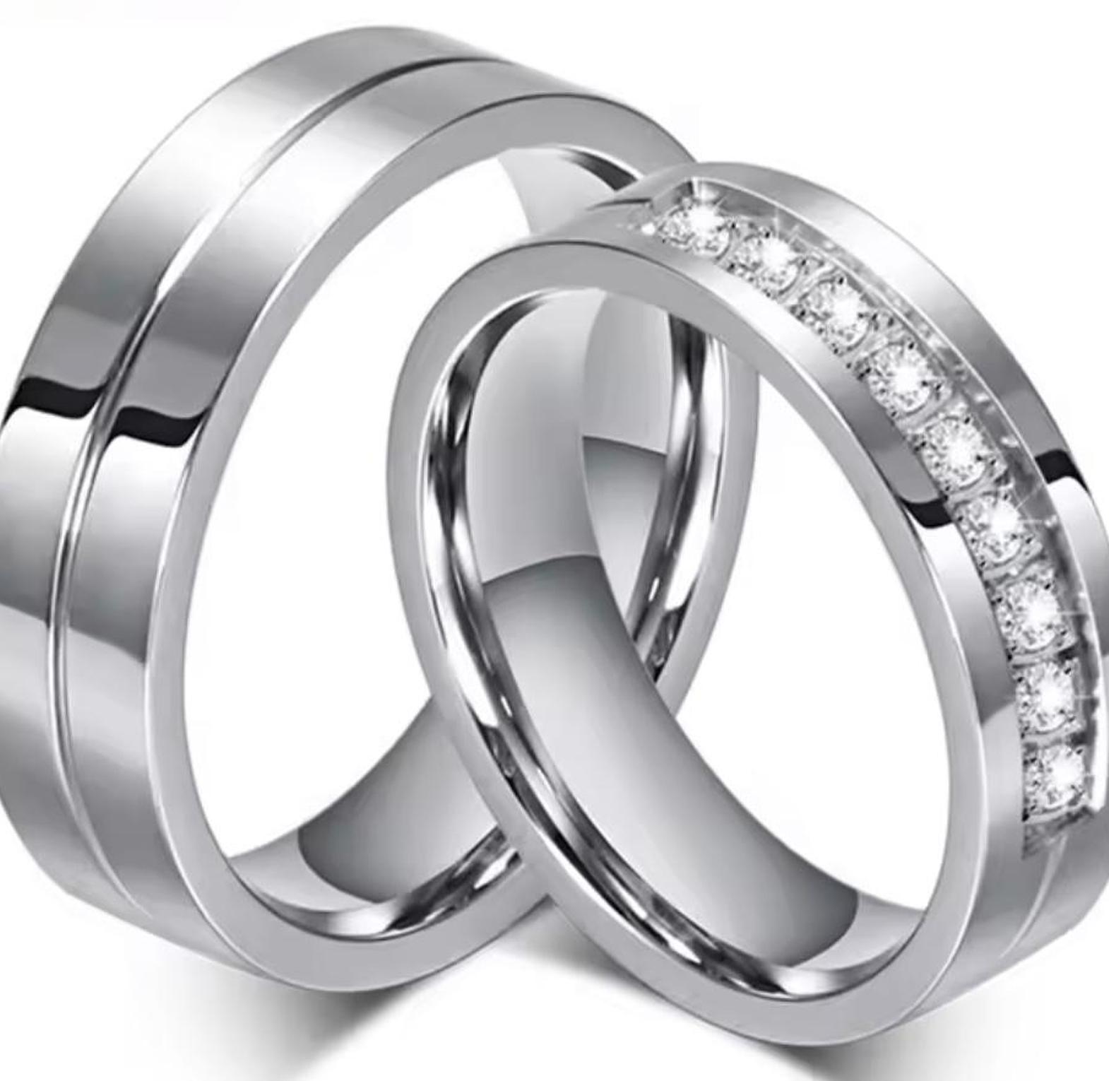 This matching set of wedding bands, available in both gold and silver tones, is crafted from resilient stainless steel for lasting quality. The woman's ring features a brilliant AAA cubic zirconia pave setting, while the man's band offers a sleek, uninterrupted high-polish finish. Men Sizes 7-12, Ladies Sizes 5-9