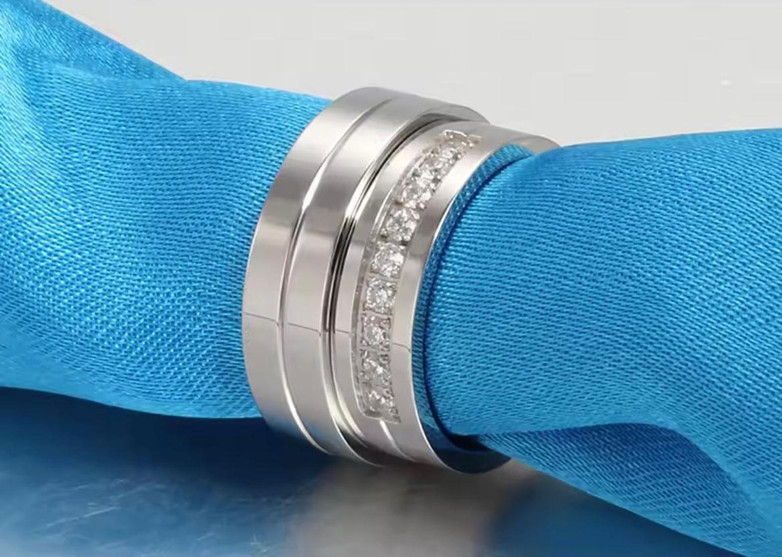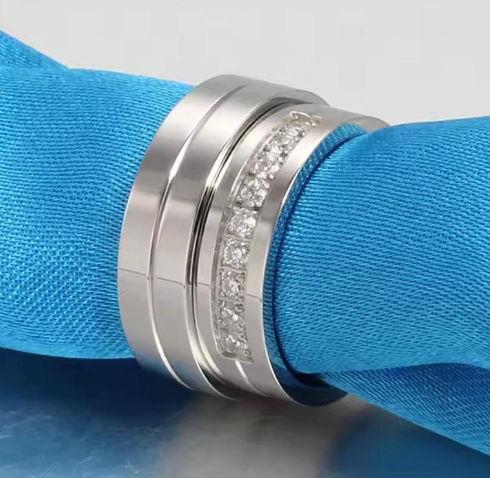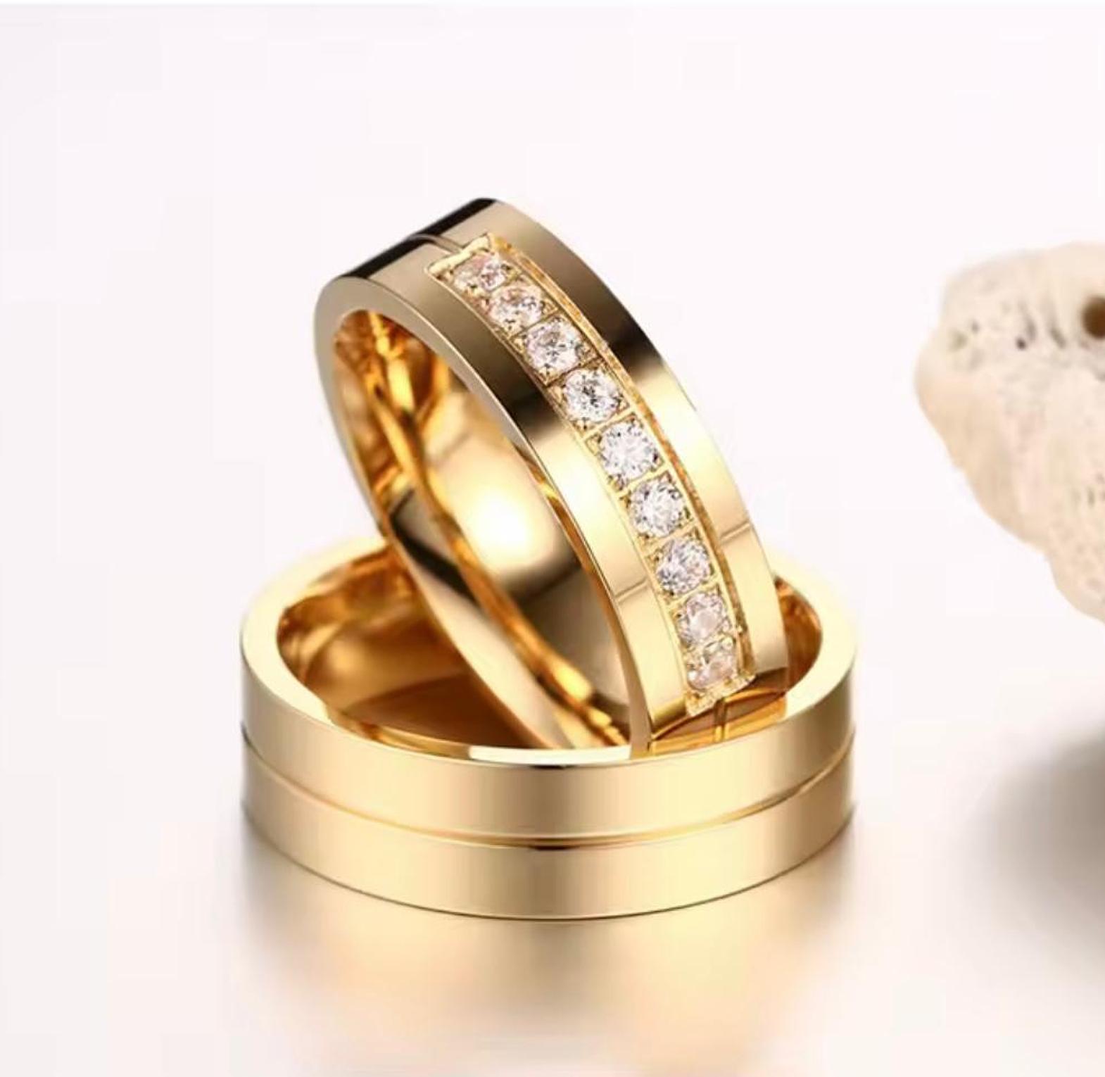 This matching set of wedding bands, available in both gold and silver tones, is crafted from resilient stainless steel for lasting quality. The woman's ring features a brilliant AAA cubic zirconia pave setting, while the man's band offers a sleek, uninterrupted high-polish finish. Men Sizes 7-12, Ladies Sizes 5-9